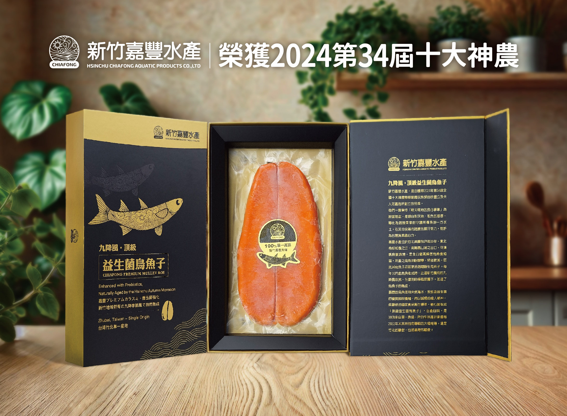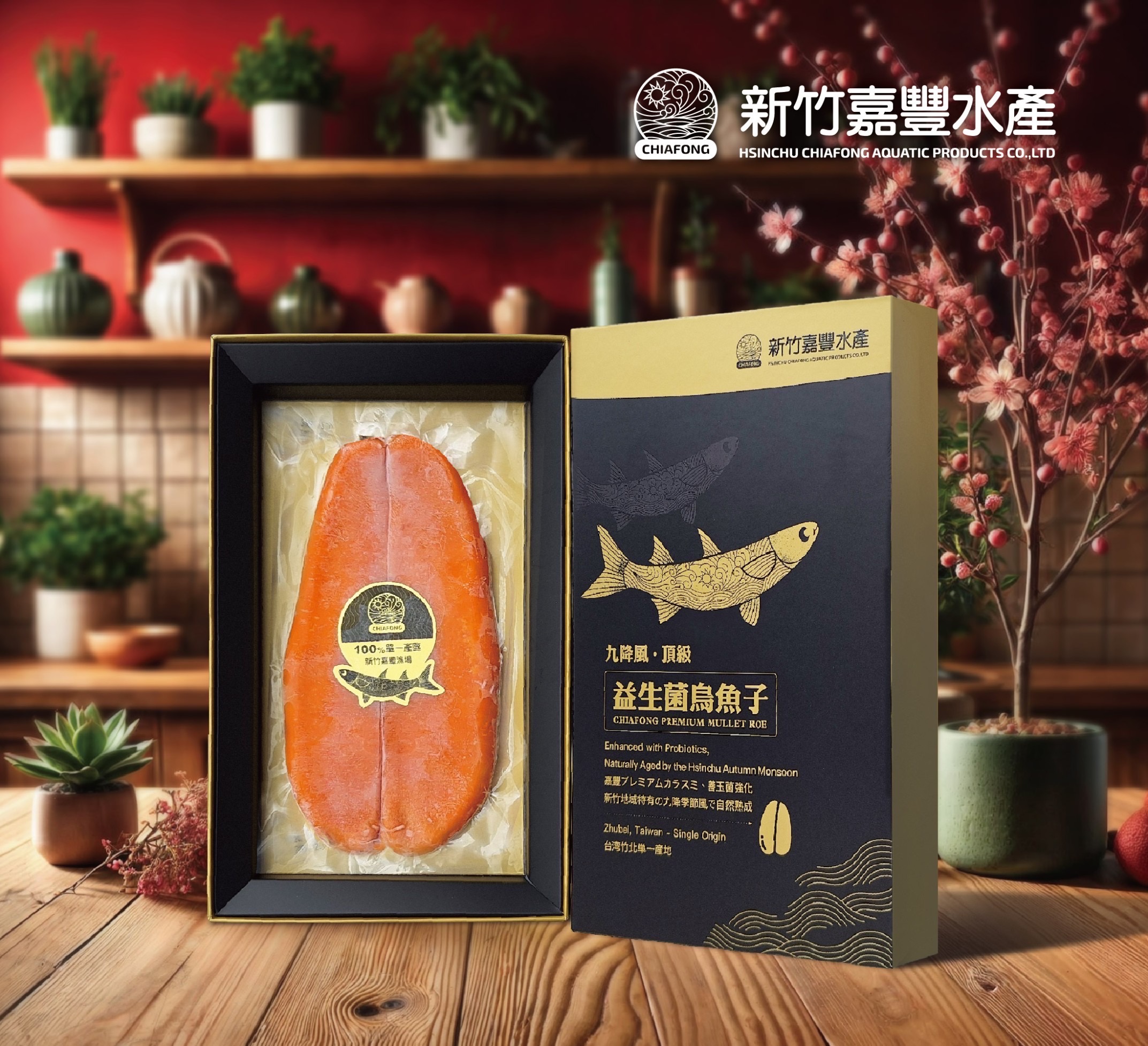 每年11月烏魚收成時正逢【九降風】報到,凜冽的東北季風加速催熟烏魚子的熟成,烏魚特別的肥美、油脂豐厚、嘉豐水產位於竹北烏魚養殖專區, 全程以益生菌及獨家上等飼料配方, 所生產出的 烏魚子外觀、色澤、飽滿度皆為上品,口感綿密粘牙,多層次的油脂風味,讓您品嚐到最棒的天然的海味!
